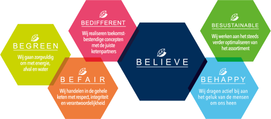 Alles over ons duurzaamheidsbeleid en hoe we daar invulling aan geven lees je op www.believe.nl, de website van ons duurzaamheidsbeleid Believe.